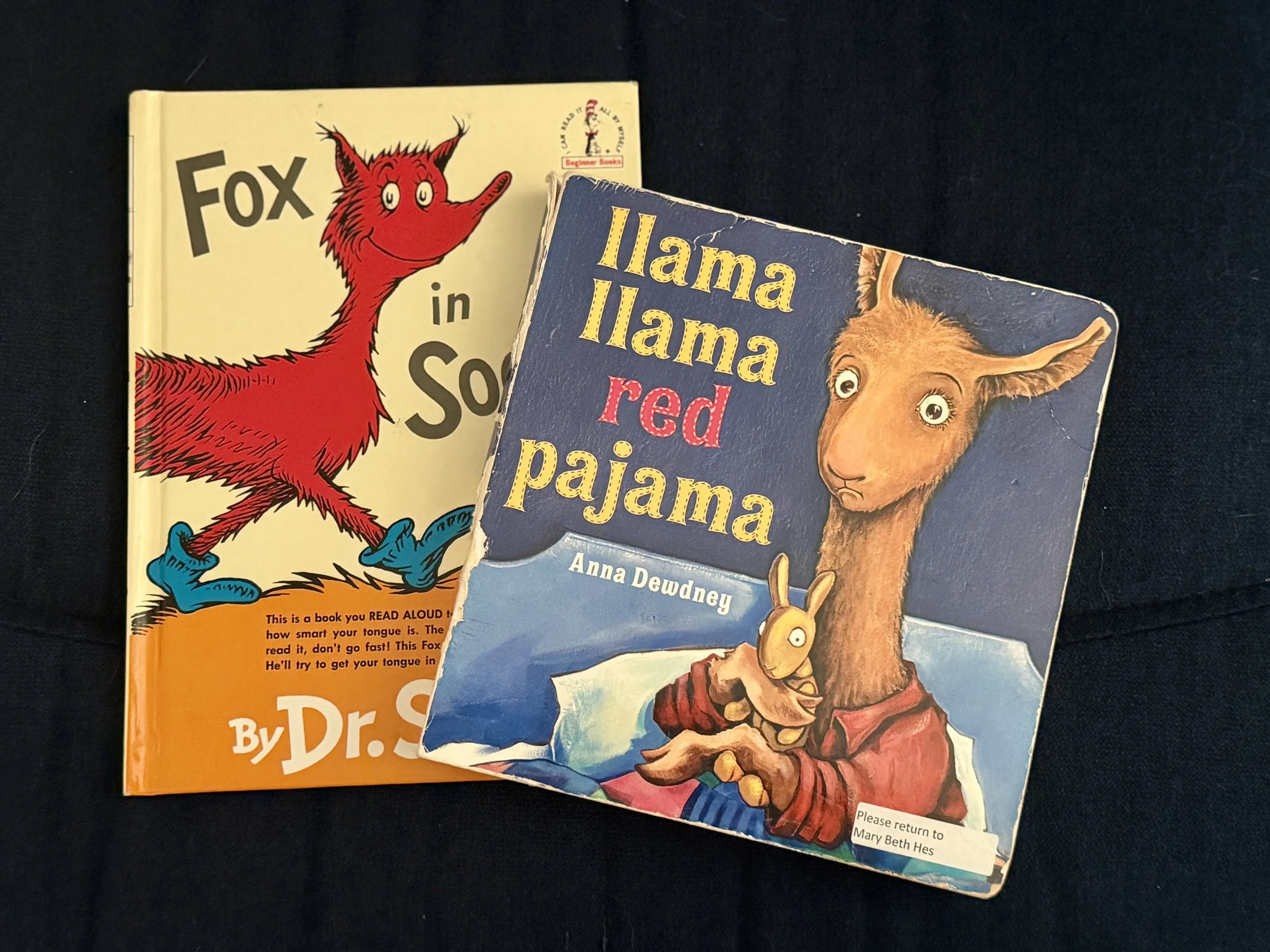 Llama, Llama Red Pajama by Anna Dewdney and Fox in Sox by Dr. Seus are a couple great examples of books that feature rhyming!